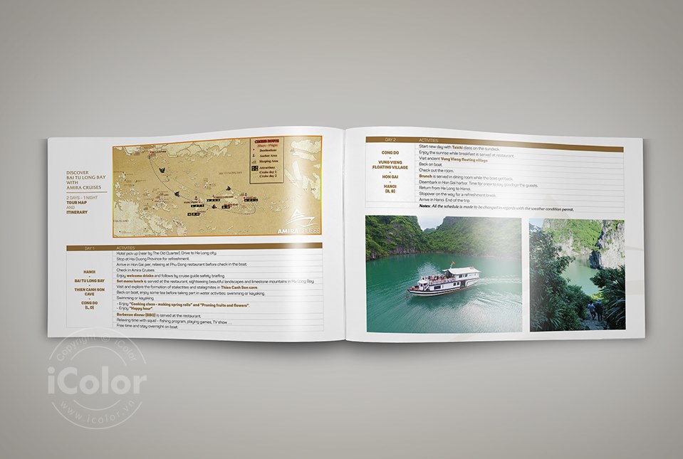 Sau khi nghiên cứu tài liệu và tham khảo ý kiến doanh nghiệp, các chuyên gia của iColor đã lựa chọn những hình ảnh tiêu biểu và những nội dung phù hợp cho cuốn profile. Profile được thiết kế gắn ngọn, xúc tích, làm nổi bật những nội dung, thông tin chính cần truyền tải. Bố cục profile được phân bổ hợp lý, hình ảnh và nội dung được kết hợp hài hòa. Phong cách thiết kế và màu trang nhã, xứng tầm đẳng cấp của công ty du lịch.